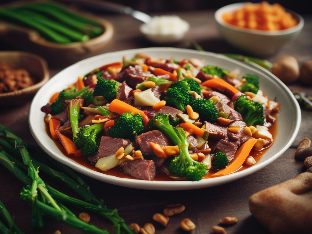 - Para ello, la carne de res tiene que estar cortada en láminas de 6 centímetros de longitud. Luego, corta las zanahorias y los porotos verdes o judías en julianas.