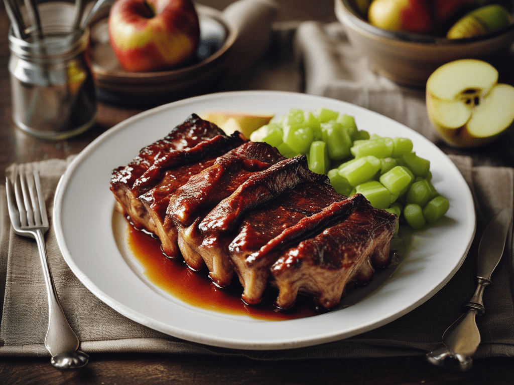 - Salpimentar las costillitas a gusto. Pasarlas por harina y colocarlas en la fuente para horno. Tapar con la preparación de las manzanas y tomates. Rociar las costillitas con vino blanco.