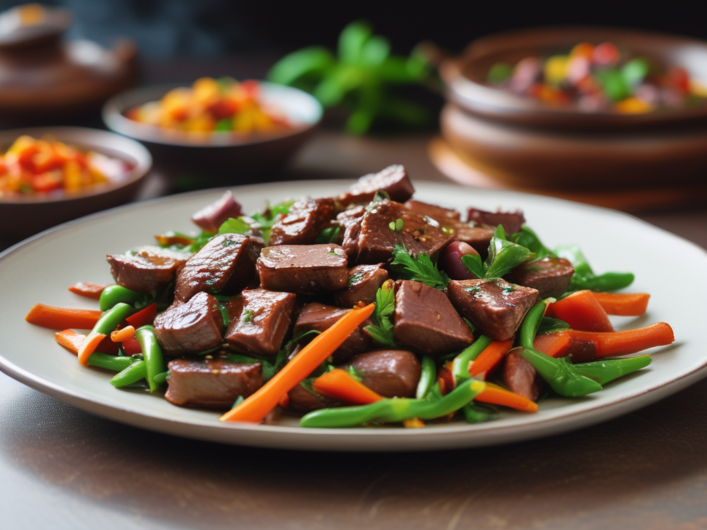 - Añada los pimientos, también cortados en tiras gruesas, y saltéelos rápidamente. Retire del sartén y reserve.