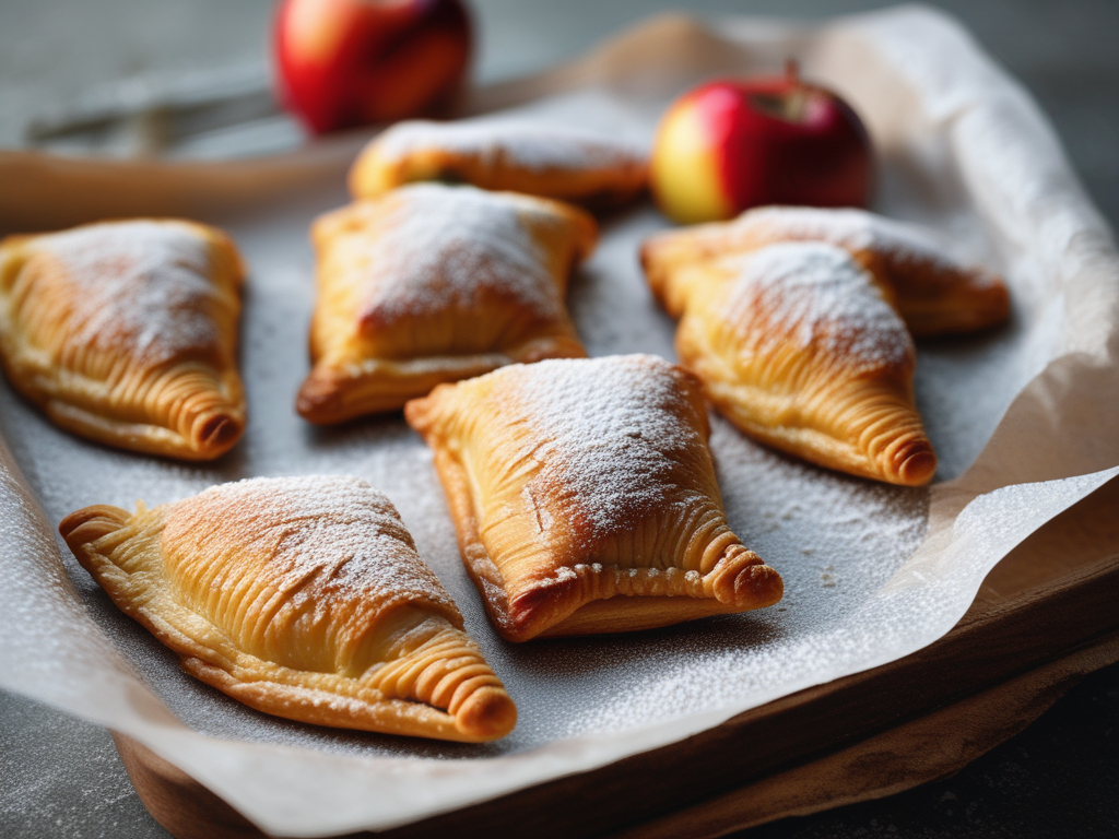 - Rellenar las tapas de empanadas con 1 cucharada de puré de manzanas y una rodaja de manzana, espolvoreando con una cucharadita de azúcar. Cerrar los bordes de las empanadas.