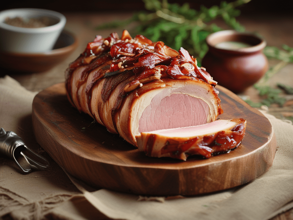 - Reúna todos los ingredientes necesarios para elaborar el lomo de cerdo relleno con beicon y queso.