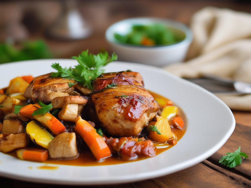- Sirve el pollo guisado en platos individuales, asegurándote de incluir una porción de pollo, verduras y salsa en cada plato. Espolvorea perejil fresco picado por encima como decoración.