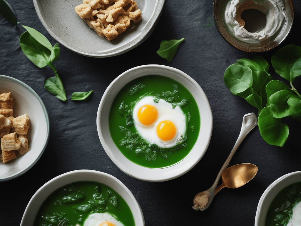 - Reparta la sopa de espinacas entre 4 platos y sirva con 1 huevo escalfado en cada plato.