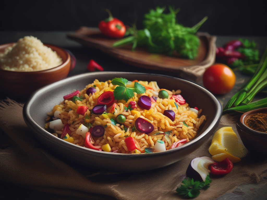 - Mezcle los vegetales con el aceite de oliva restante y viértalos sobre el arroz, cubriendo también los lados.
