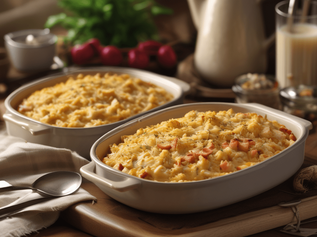 - En un molde refractario, coloque una capa de arroz, luego agregue el relleno de pollo y cubra con un poco de crema. Repita este proceso y termine con una capa de arroz y crema.