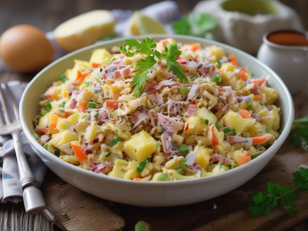- Mezcla todos los ingredientes con una cuchara de madera hasta que estén bien combinados. Refrigera la ensalada para enfriarla.
