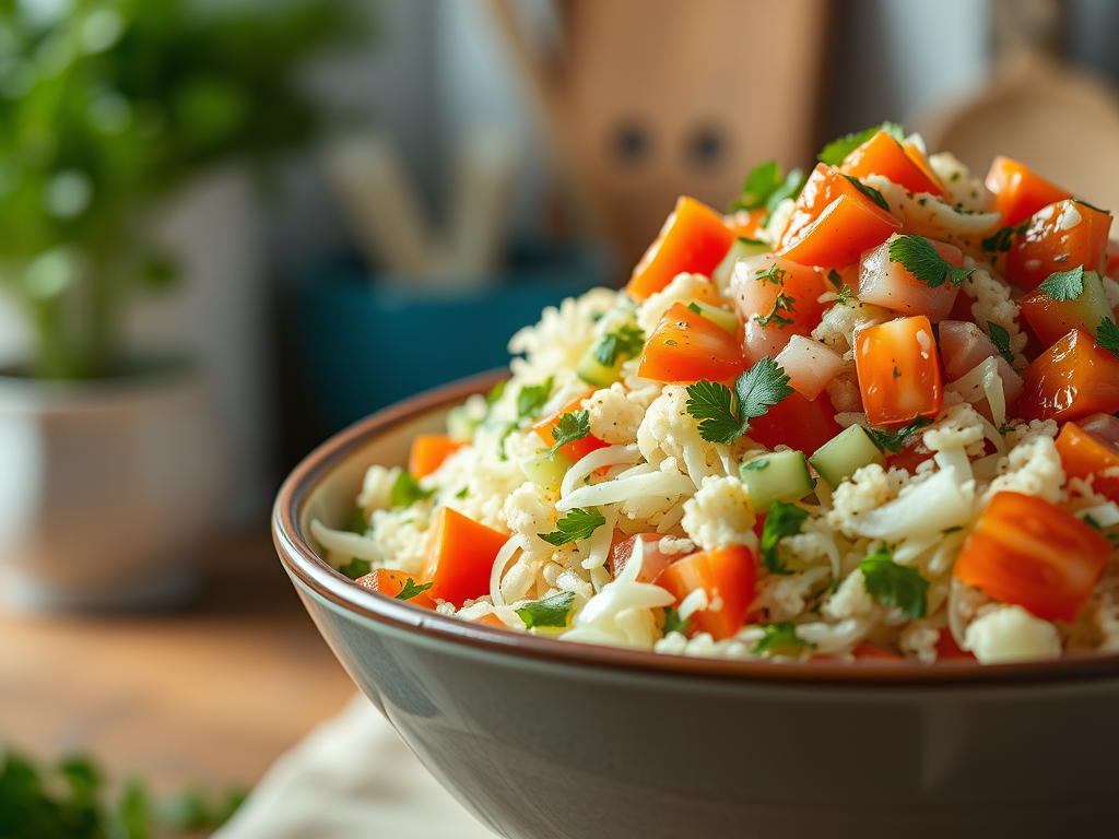 Esta Ensalada de coliflor estilo tabule es una alternativa ligera, fresca y saludable, ideal para acompañar tus comidas o disfrutar como plato principal. ¡Pruébala y sorprende a tus invitados con esta opción nutritiva!