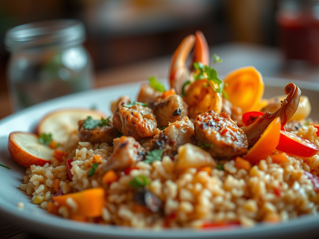¡Listo! Disfruta de este delicioso arroz con rabito de puerco, bacalao y mariscos. Este plato es ideal para un almuerzo especial lleno de sabor caribeño.