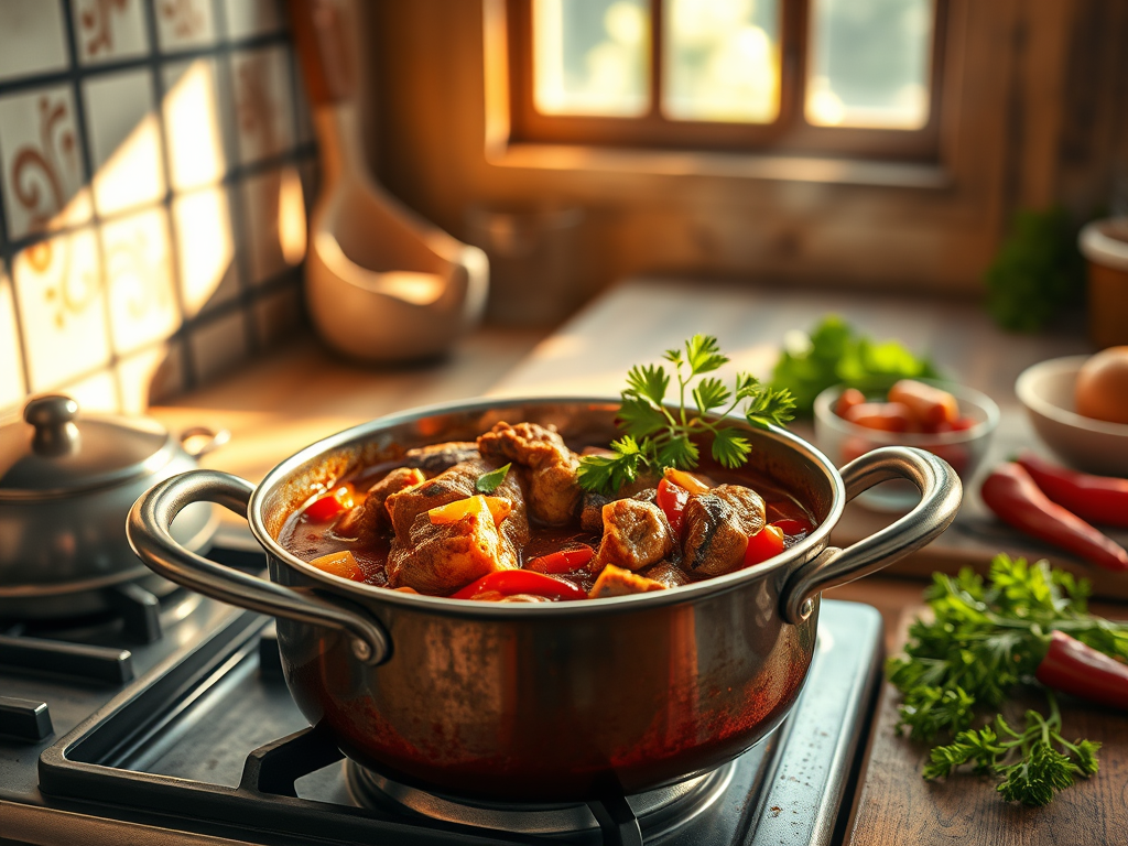 Devuelve los trozos de conejo a la cacerola. Añade el caldo de pollo (o agua) hasta cubrir ligeramente la carne. Tapa y cocina a fuego bajo durante 45-50 minutos, removiendo ocasionalmente, hasta que el conejo esté tierno y la salsa espese.