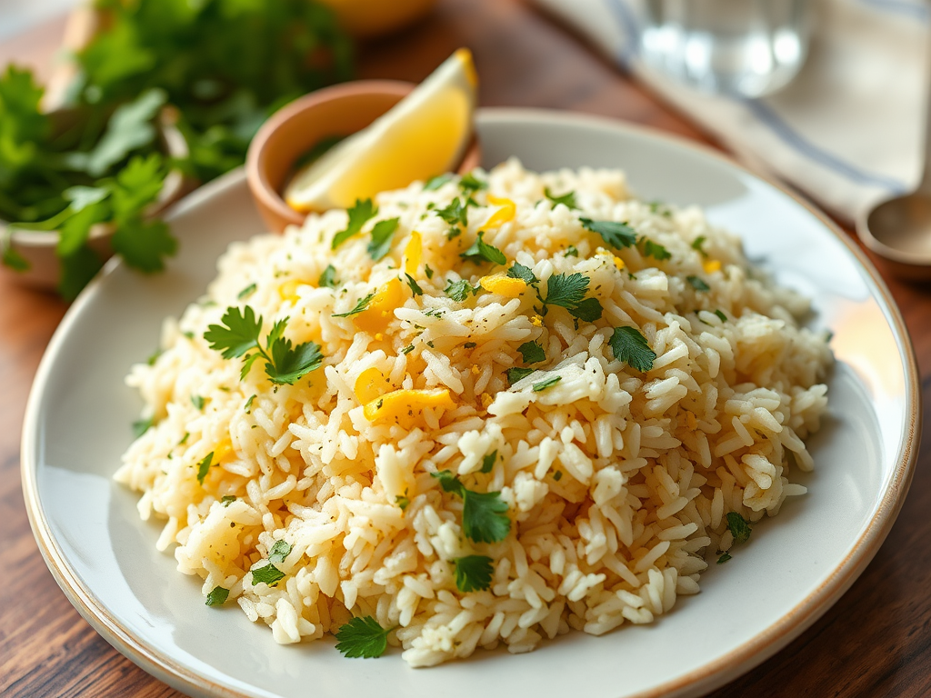 Sirve el arroz al cilantro y limón caliente, acompañado de tu platillo favorito. Puedes decorar con un poco más de cilantro fresco para resaltar su color y aroma.
