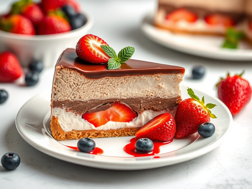 - Decora: antes de servir, cubre con una capa de salsa de fresa o ganache de chocolate. Añade frutas frescas al gusto y, si deseas, decora con láminas de chocolate.