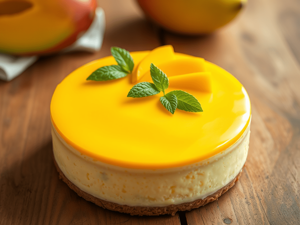 Corta los 2 mangos restantes en rebanadas delgadas y decora la superficie con ellas. También puedes añadir hojas de menta o un toque de ralladura de limón para un acabado más fresco.