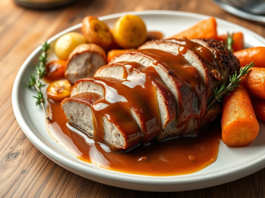 Esta receta presenta la preparación de un rosbif de cerdo con salsa gravy, acompañado de papas y zanahorias salteadas.