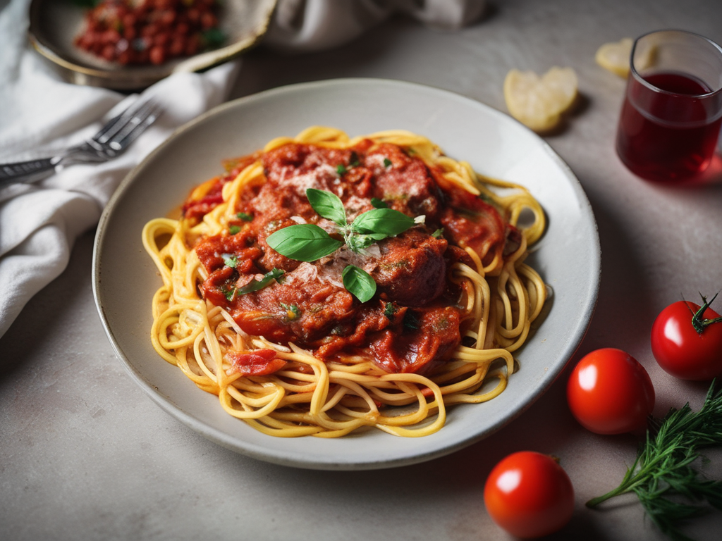 Ingredientes: 400g carne molida, 400g jitomates, 290g puré de tomate, 1/2 taza agua, 2 ajos, 400g espagueti, 1/2 cdta. sal, 1/2 cdta. pimienta, 1/4 taza aceite oliva. Preparación: Cocinar carne, añadir ingredientes, cocinar salsa, cocinar pasta, servir con queso parmesano.