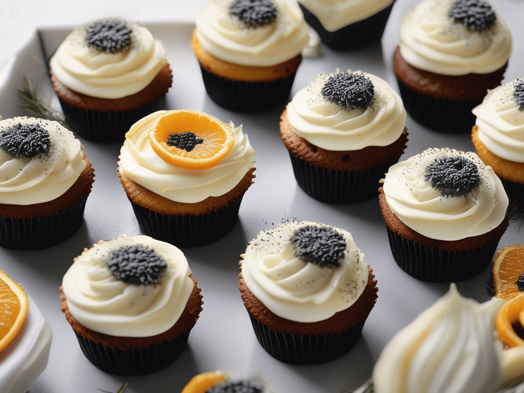 Para hacer cupcakes de naranja con crema de queso, mezcle ingredientes, hornee y decore con una crema de queso Philadelphia, zumo de naranja y azúcar glas. Refrigere y ¡disfrute!